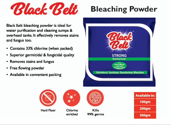 Black belt bleaching powder is ideal for water purification and cleaning sumps and overhead tanks. It effectively removes stains and fungus too.