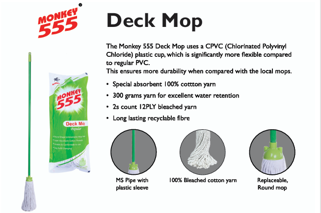 The monkey deck mop uses a CPVC plastic cup, which is significantly more flexible compared to regular PVC. This ensures durability when compared with the local mops.