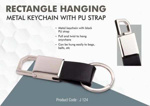 – Metal keychain with black PU strap – Pull and twist to hang anywhere – Can be hung easily to bags, belts, etc