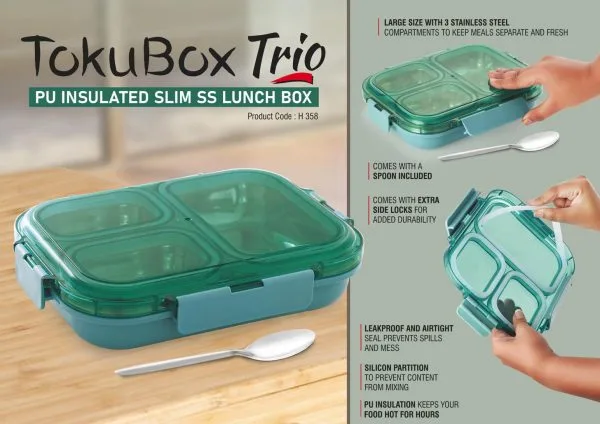 The TokuBox Trio Slim Lunch Box is the perfect blend of style, durability, and convenience. Designed with a stainless steel inner lining and PU filling, it keeps food hot and fresh for hours. The 3 smart partitions with a silicon seal ensure your food stays separate and leak-free, while the slim and compact design makes it easy to carry in bags. It also comes with a spoon included, making it a complete meal solution for school, office, or travel. Say goodbye to spills and hello to healthy, hassle-free eating on the go.